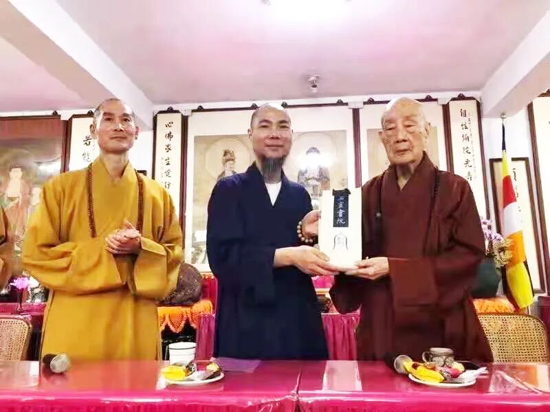 △2010年净良长老任台湾中国佛教会长时与台北佛教会长界云大和尚莅临石室禅院交流互赠礼物时合影