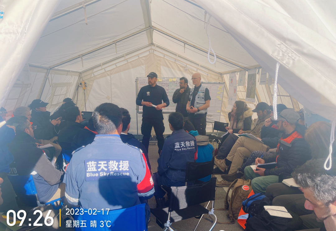 17日清晨水草队长参加了联合国救援会议,在指挥部门安排下在哈塔伊震区开展救援。